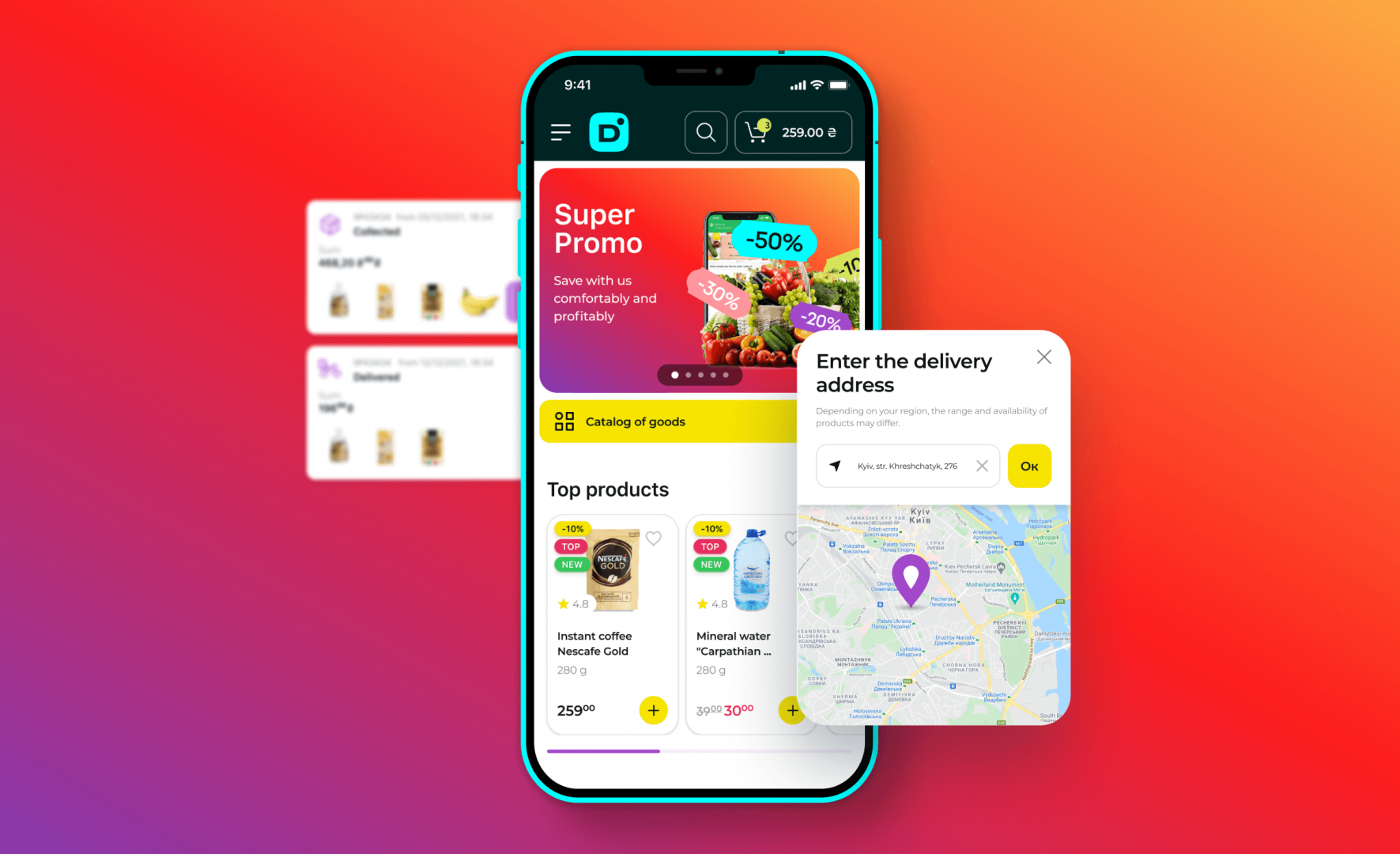 The functionality of e-commerce is presented in relevant design with intuitive UX. The directory available to the user depends from the assortment in the nearest darkstore, order delivery status can be tracked in real time.
