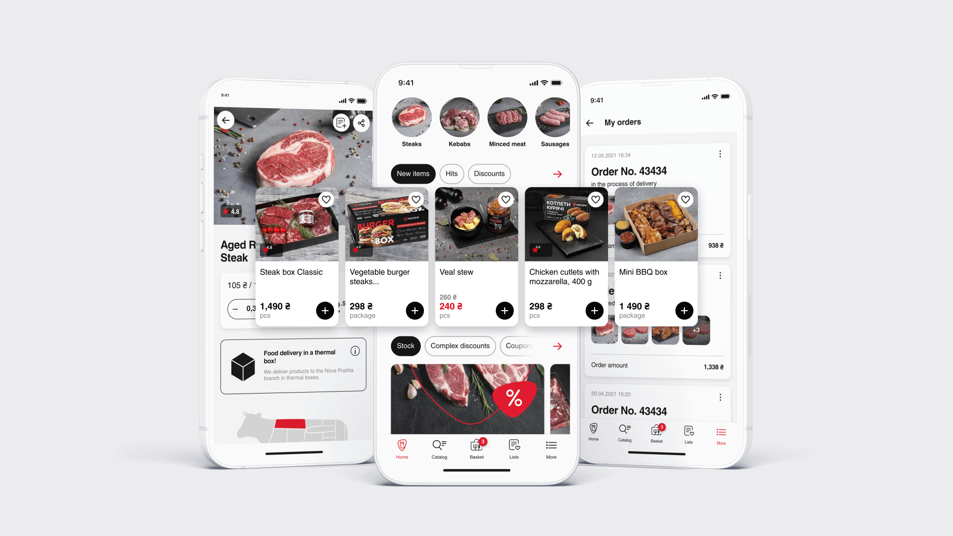 The application combines the capabilities of an online restaurant and a store, this dictates the logic of the sections. Ordering ready-made meals is available only for residents of Kyiv and the suburbs. Still, raw meat and semi-finished products can be delivered anywhere in the country in a thermo-box.