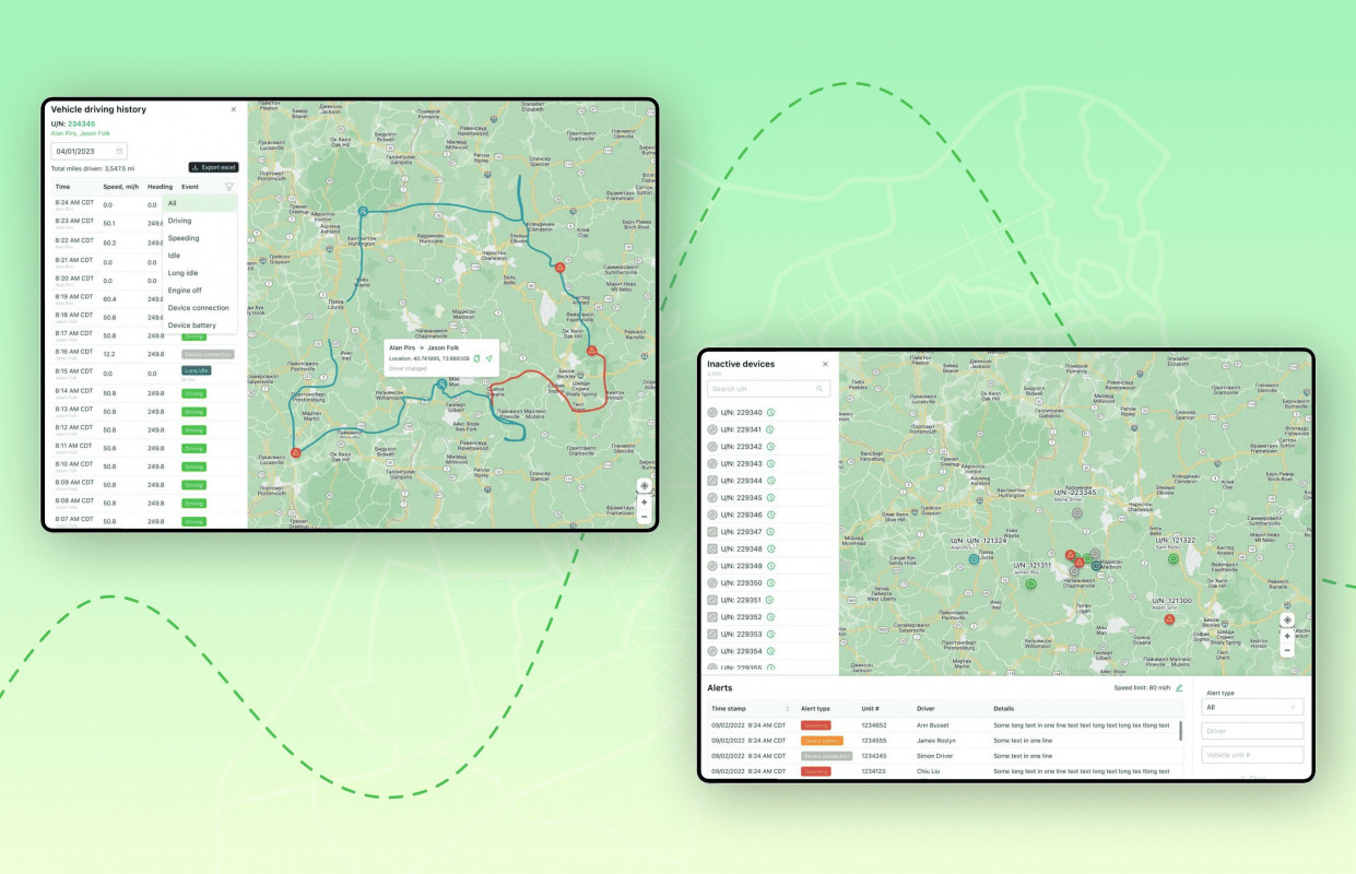 The truck sensor data platform automatically detects deviations from the route, as well as records downtime, speeding violations, and aggressive driving. All events can be viewed both in reports and via API. Support for ADAS scenarios strengthened control over traffic safety and gave the client an effective telematics data visualization tool for preventing potential emergency situations.